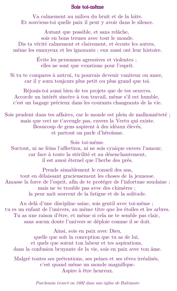 Un corps t’a été donné. Tu peux l’aimer ou le détester, mais ce sera le tien pour toute la durée de cette vie. Tu vas apprendre des leçons. Tu es inscrit(e) dans une école informelle à plein-temps appelée “Vie”. Chaque jour, tu auras l’occasion d’apprendre des leçons dans cette école. Tu pourras aimer les leçons, ou penser qu’elles sont idiotes ou sans objet. Il n’y a pas de fautes ou d’échecs, seulement des leçons. La croissance est un processus “essai-erreur-correction” ; elle consiste à expérimenter, à faire des expériences. Les expériences “ratées” font tout autant partie du processus que celles qui “réussissent”. Une leçon sera répétée jusqu’à ce qu’elle soit acquise, intégrée. Une leçon te sera présentée sous diverses formes, jusqu’à ce que tu l’apprennes. Quand tu l’auras apprise, tu pourras passer à la leçon suivante. Apprendre des leçons ne finit jamais. Il n’y a pas de partie de “Vie” qui ne contienne de leçon. Si tu es en vie, il y a des leçons à apprendre. « Ailleurs” n’est pas meilleur qu’“ici”. Quand ton “ailleurs” est devenu “ici”, tu obtiens à nouveau un autre “ailleurs” qui, à son tour, te semblera meilleur qu’“ici”. Les autres sont essentiellement des miroirs de toi-même. Tu ne peux aimer ou détester “quelque chose” chez autrui, que si ce “quelque chose” reflète une caractéristique, que tu aimes ou que tu détestes en toi. Ce que tu fais de ta “Vie” dépend de toi. Tu as tous les outils, toutes les ressources dont tu as besoin. Tu es le créateur de ta vie. Ce que tu en fais dépend de toi. Le choix t’appartient. Tes réponses sont en toi. Les réponses aux questions de la “Vie” sont en toi. Tout ce qu’il faut, c’est regarder, écouter, sentir et faire confiance. Tu es la source. A mesure que tu t’ouvres à cette confiance, tu te souviendras de plus en plus de tout ceci. (auteur inconnu)